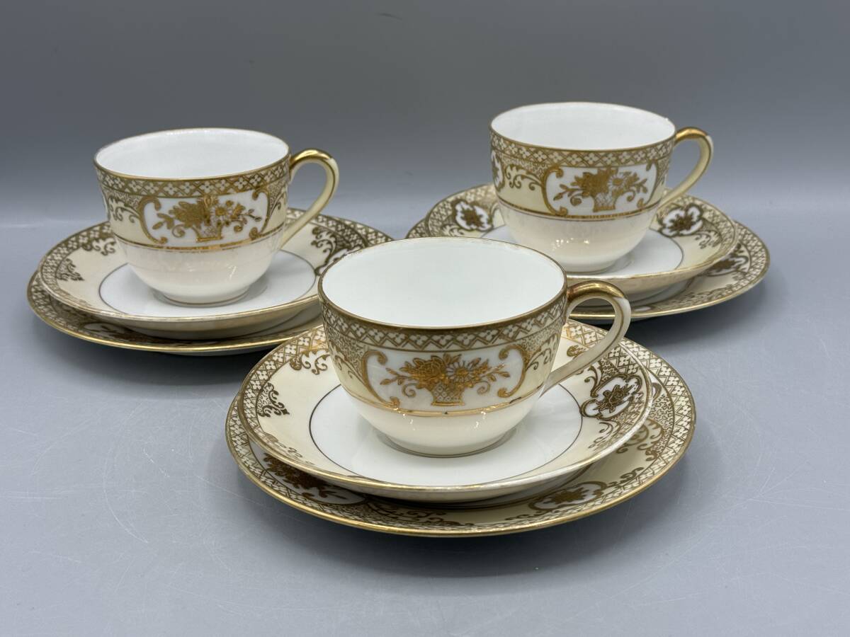 > 里帰り ノリタケ フラワーバスケット 3客 トリオ カップアンドソーサー ケーキ 皿 (-8-A) プレート 金彩 お花 マルキ印 カップ&ソーサー