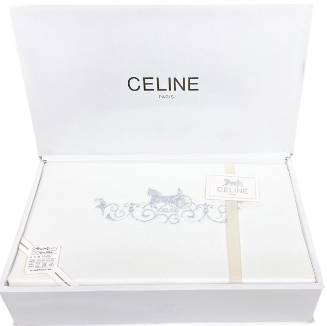 > 未使用 セリーヌ フラットシーツ シーツ 寝具 シングル ホワイト 寝具用品 カバー 馬車柄 綿100% CELINE 【中古】