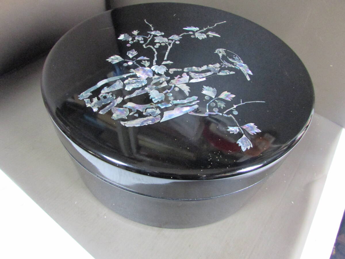 - 茶道具 茶櫃 螺鈿入り 花鳥図 径:(約30㎝x蓋含H13㎝)樹脂/製