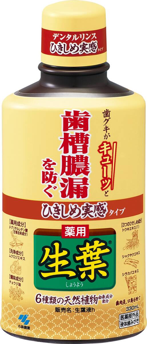 ▼▼▼▼▼▼注意事項▼▼▼▼▼▼・送料込み(送料650円が商品価格に含まれています) 一部地域では追加送料あり。・お取り寄せ商品です。弊社にて手配後、メーカー・卸業者からの直送になります。・まれにメーカー欠品、出荷遅延等が発生致します。問題発生時は別途メールにてご連絡致します。・配送方法の指定、日時指定、置き配、ギフト対応、他商品との同梱配送などは対応できません。・まとめ買いや複数購入の場合は通常より発送に時間が掛かる場合がございます・複数個口の場合、2階以上への搬入ができない場合があります。(その場合は1階での受け渡しとなります)・大型連休、お盆、年末年始などは発送をお休みさせていただく場合がございます・メーカー都合により、パッケージは予告なく変更される場合がございます・梱包用のダンボールはリサイクル品を使用させていただきます。・注文に関するご連絡(注文確定通知・発送通知など)はメールでご案内させていただきます※商品ページの内容について、少しでもご不明な点などがございましたら購入前に一度ご連絡ください▲▲▲▲▲▲注意事項▲▲▲▲▲▲〇商品説明6種類の天然由来の成分配合、歯槽膿漏、歯肉炎を予防しますヒノキチオール(ヒバ含有合成成分)、β−グリチルレチン酸(甘草由来成分)配合3つのひきしめ成分、シラカバエキス、トウキエキス(1)、シャクヤクエキス配合ひきしめ実感のあるハーブミント味※本剤は薄茶色の透明な液体です原産国 : 日本原材料 : 溶剤:精製水、エタノール/湿潤剤:ソルビット液/可溶剤:ポリオキシエチレン硬化ヒマシ油/矯味剤:乳酸アルミニウム、チョウジ油/香味剤:香料(ハーブミントタイプ)/pH調整剤:水酸化ナトリウム/ 薬用成分:β-グリチルレチン酸、ヒノキチオール/収れん剤:シラカバエキス、トウキエキス(1)、シャクヤクエキス/清涼剤:l-メントール/防腐剤:パラベン/洗浄剤:ムクロジエキス/ 着色剤:赤色102号、黄色4号、青色1号内容量 : 330mL商品サイズ (幅X奥行X高さ) : 76mm×54mm×178mm〇商品仕様単品サイズ76×178×54(mm)容量330ML(出典:小林製薬)