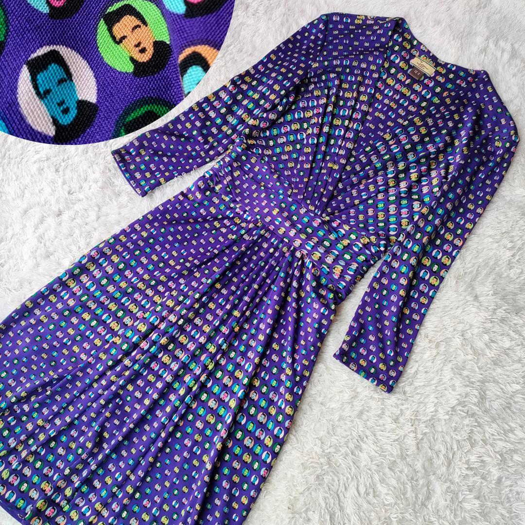 - Issa LONDON イッサロンドン シルク フェイス柄 ワンピース カシュクール風 紫 M ドット 水玉 7部袖 絹100%