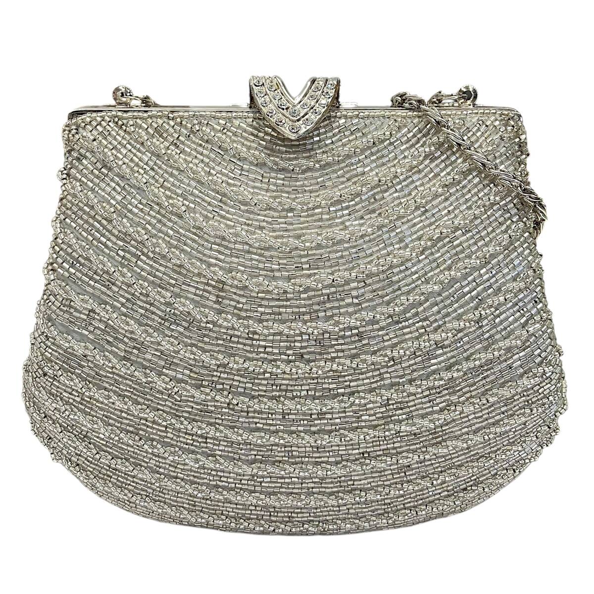- パーティーバッグ フォーマルバッグ がま口 総ビーズ シルバー 銀 結婚式 ハンドバッグ レディース