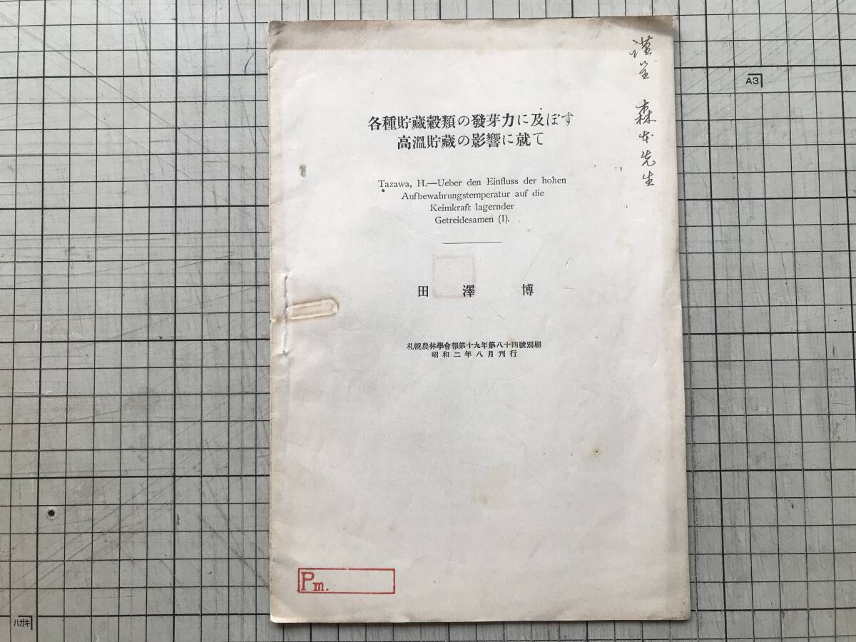 - 『各種貯蔵穀類の発芽力に及ぼす高温貯蔵の影響に就て 札幌農林学会報第19年第84号別刷』田澤博 1927年刊 ※玄米・籾・小麦・大麦 等 00239