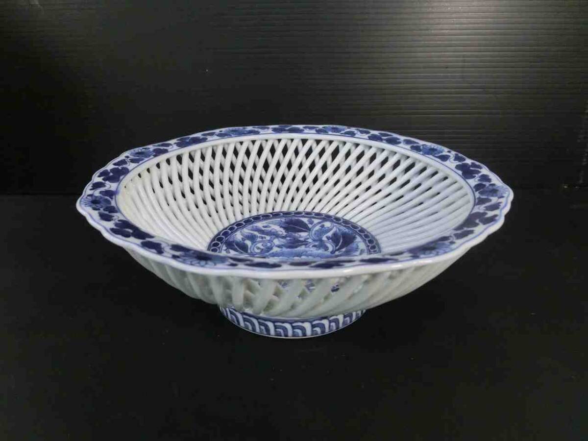 > ♪♪【7E22⑤ar】透かし鉢 有田焼 砥部焼 菓子鉢 フル-ツ鉢 琴峰 網目透かし染付菓器♪♪