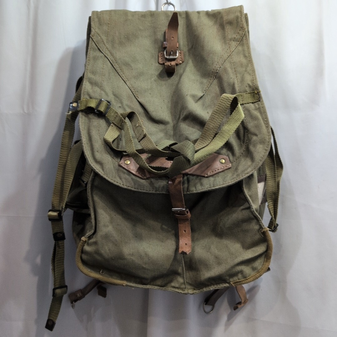 > 70s 実物 ルーマニア軍 キャンバス リュック バックパック ミリタリー レザー 鞄 かばん オリーブ カーキ ユーロ ヨーロッパ Q