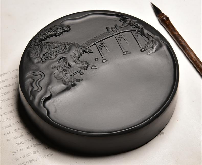 - 佳品 上品な硯 收藏 プレゼント 天然原石 老坑 竜尾山 黒竜尾《江南の山水》純手作り硯 歙硯 端硯 用 書道 絵画 文房四寶