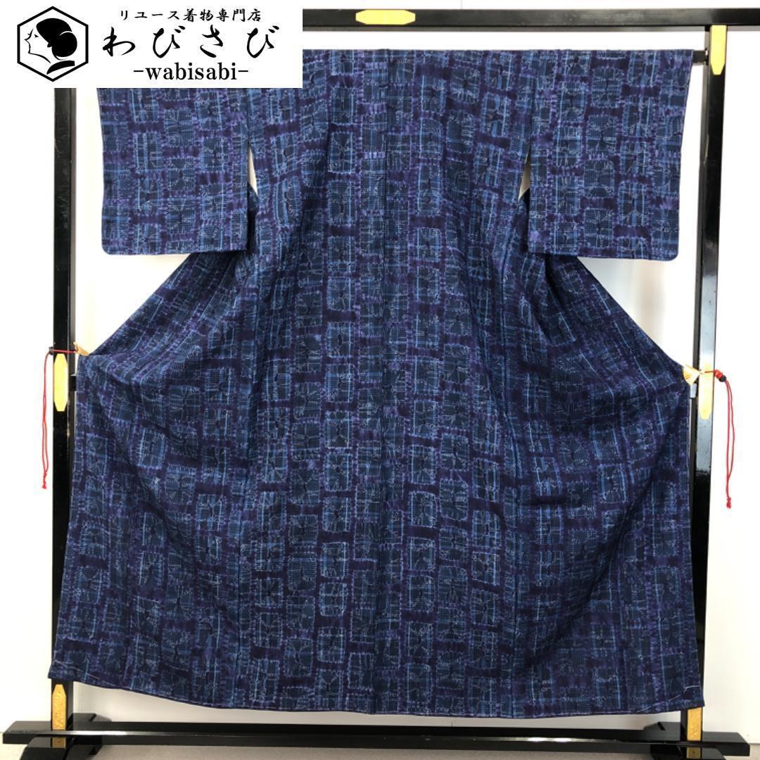 > 小紋 四角に絞り柄 濃藍色 しつけ糸 K-4800 着物 きもの kimono 和服 和装 中古 リサイクル着物 【送料無料】