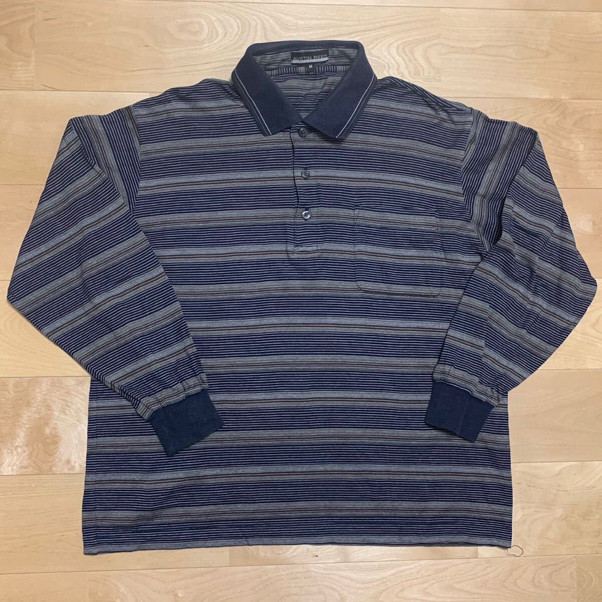 - 衿付マルチボーダー長袖シャツ 長袖カットソー 綿 ネイビー 紺色 長袖ポロシャツ 長袖トップス メンズ 秋冬 コットン
