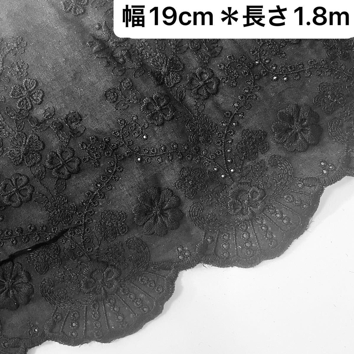 > 幅19cm 長さ1.8m ブラック 黒 花柄 フラワー 刺繍生地 コットン お花 片耳スカラップ ハンドメイド 手芸 レース ハギレ 綿