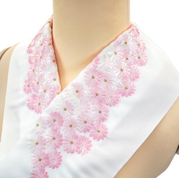 - 刺繍 半衿 白地 ピンク糸 菊 he-018 振袖 訪問着 小紋 成人式 結婚式 半襟 半えり 白