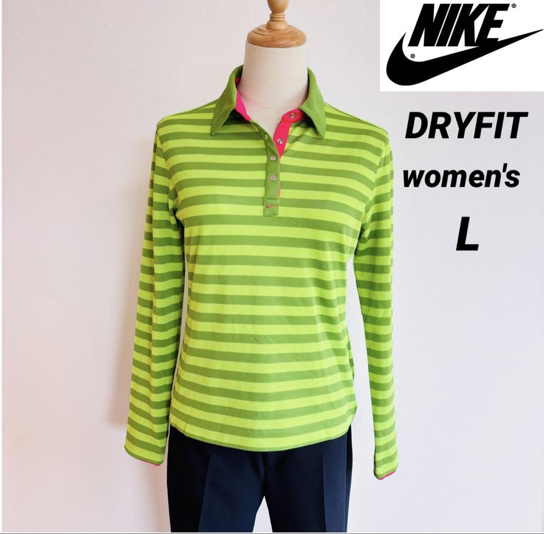 > NIKE FITDRY ナイキ フィットドライ ゴルフ レディース 長袖ポロシャツ ボーダー L グリーン