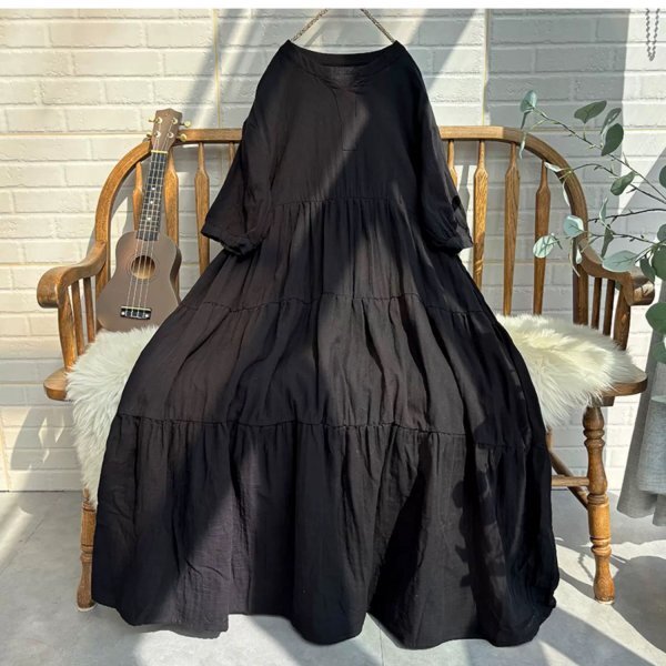 - yy ティアードワンピース ゆったりダブルガーゼ ふんわり アンティーク風 ロマンファッション 純色 綿100% ブラック