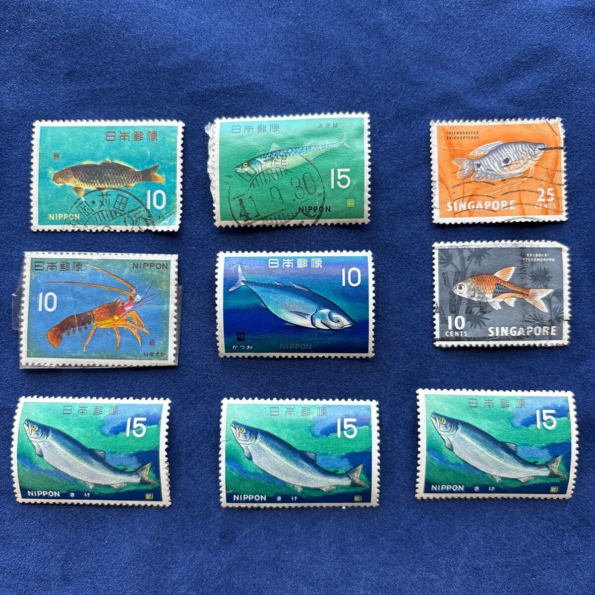 - 日本切手【魚介シリーズ】1966年 さけ・こい・まさば・かつお・いせえび【シンガポール切手】ラズボラ? グラミー? 昭和切手 送料無料