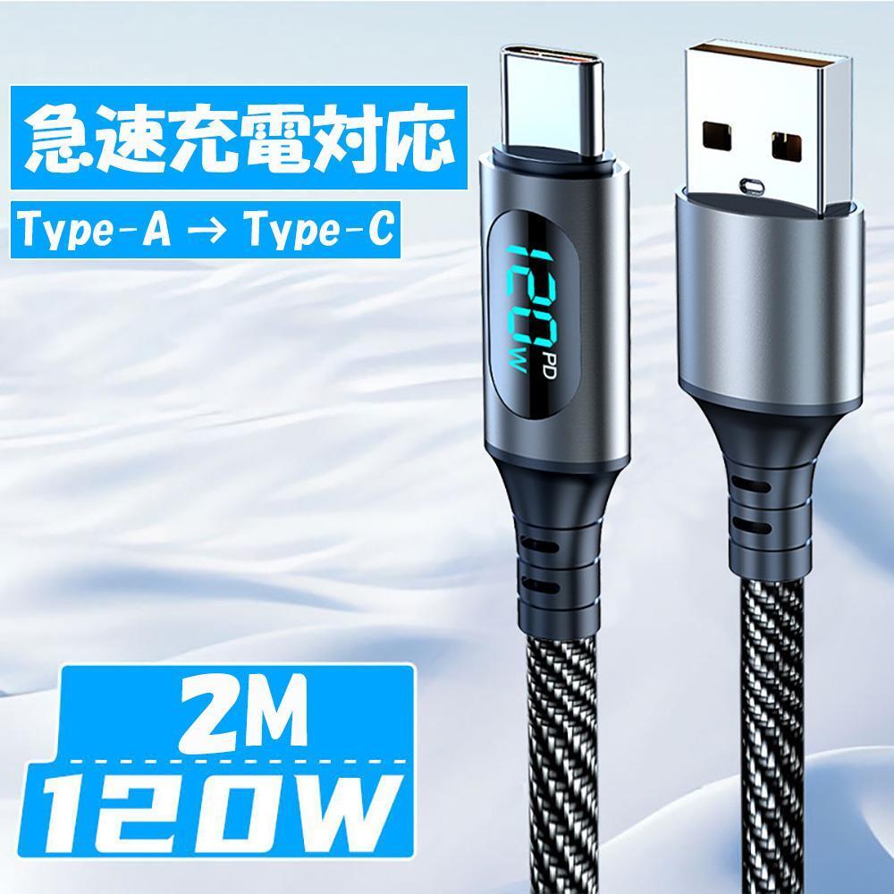 - USB ケーブル PD 2m Type-A Type-C 急速充電 デジタル表示 120W ブラック 黒