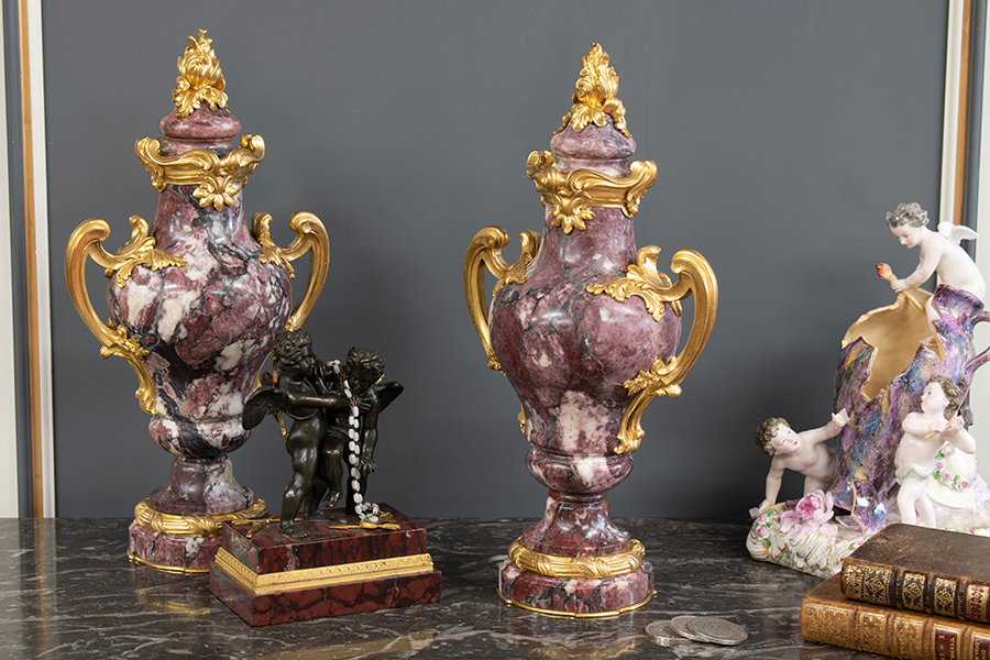 Brche violette といわれる紫の大理石。総大理石の本体に金メッキされた、素晴らしい造形のブロンズ。