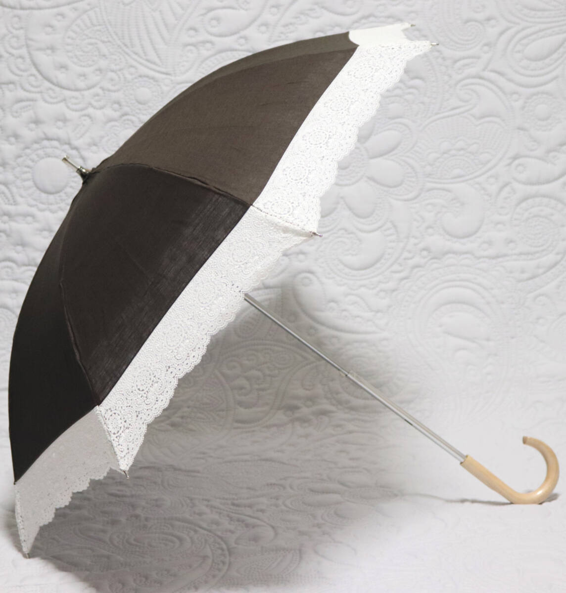 - 新品【長傘 日傘】麻綿 縁レース 長さ2段階 濃茶 純パラソル v7102