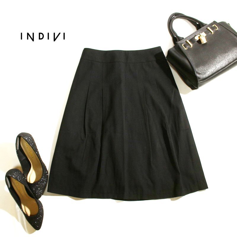 > 美品 インディヴィ INDIVI 株) ワールド 春 夏 ほんのり ヘンリボーン 綺麗め Aライン フレア スーツ スカート 38 ブラック 黒 オフィス