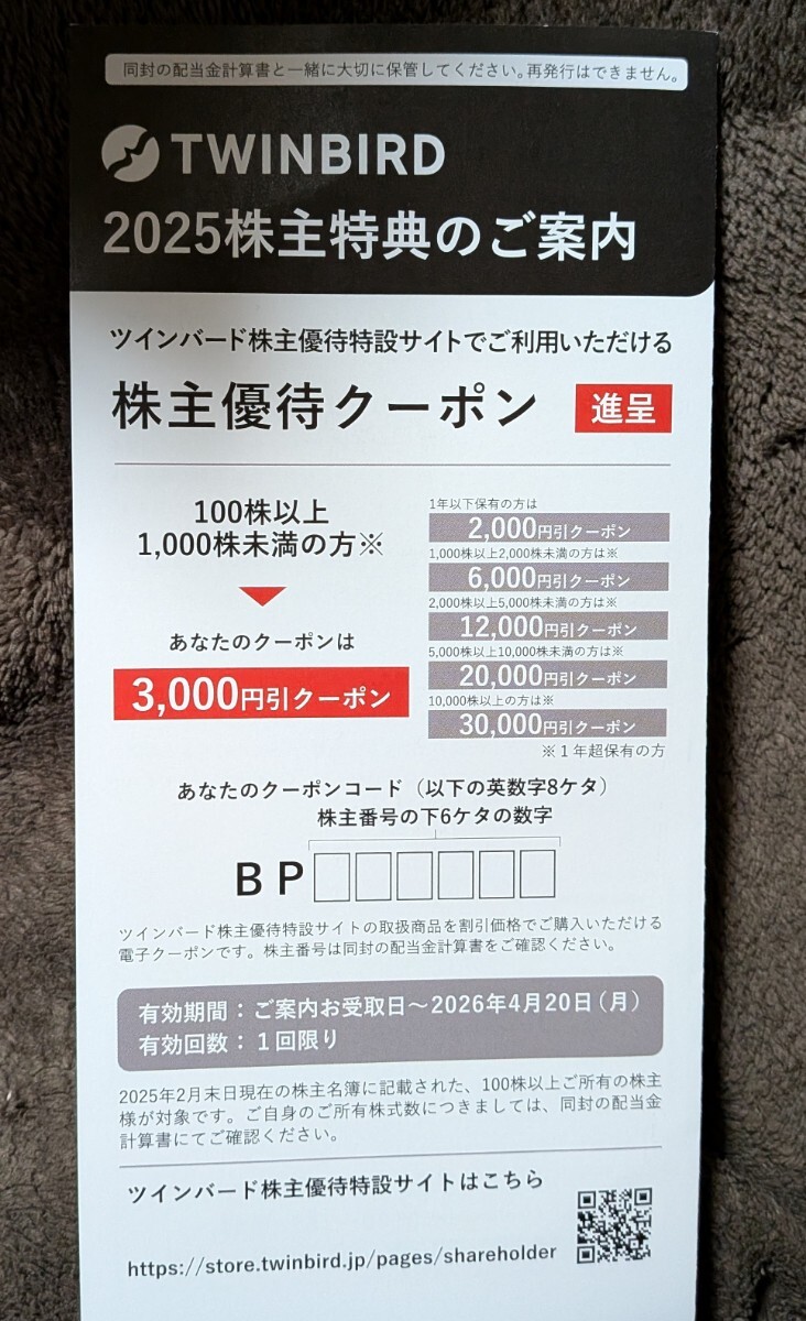 - ツインバード 株主優待 3000円 ★有効期限:2026年4月20日迄
