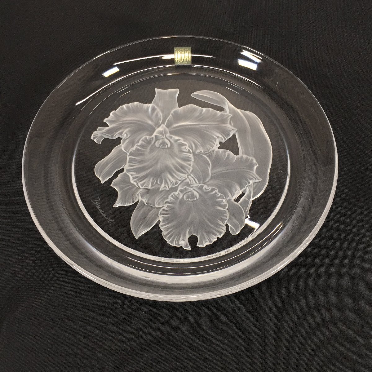 > ER-80【 HOYA CRYSTAL 】 ホヤ クリスタル 保谷 クリスタルレリーフ皿 飾り皿 クリスタルガラス カトレア 裏彫り 型彫り 直径 約 21cm