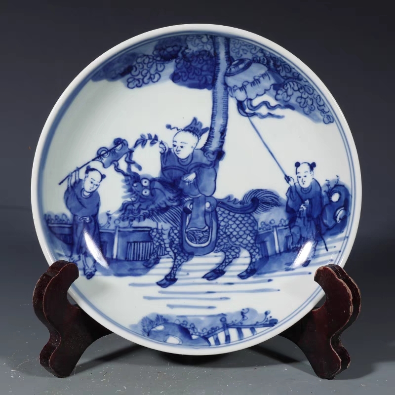 - 清時代 乾隆年製款 古陶磁器 青花 麒麟紋 送子盤 盤子文案置物 擺件 時代物 古董品 骨董 旧家蔵出 唐物 中国古玩 古美術品