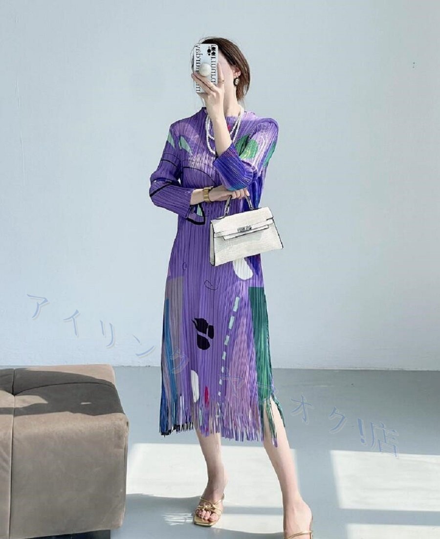 > 新品★レディーストップスプリーツワンピースチュニックロング丈ドレープ性いい弾力が あり肌触りいい素敵プリント 紫