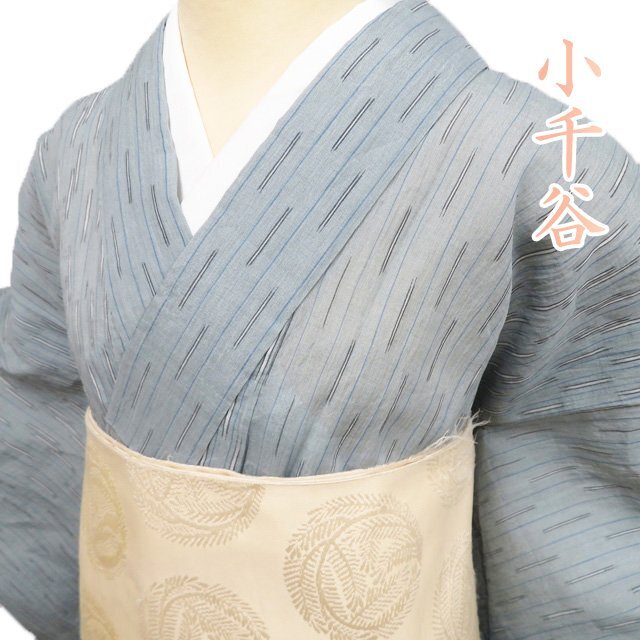 - 特選 夏物 夏着物 着物 中古 麻 カジュアル 小千谷 縞模様 やや薄い湊鼠色 多色 身丈153.5cm 裄64.5cm SA きもの北條 A1202-8