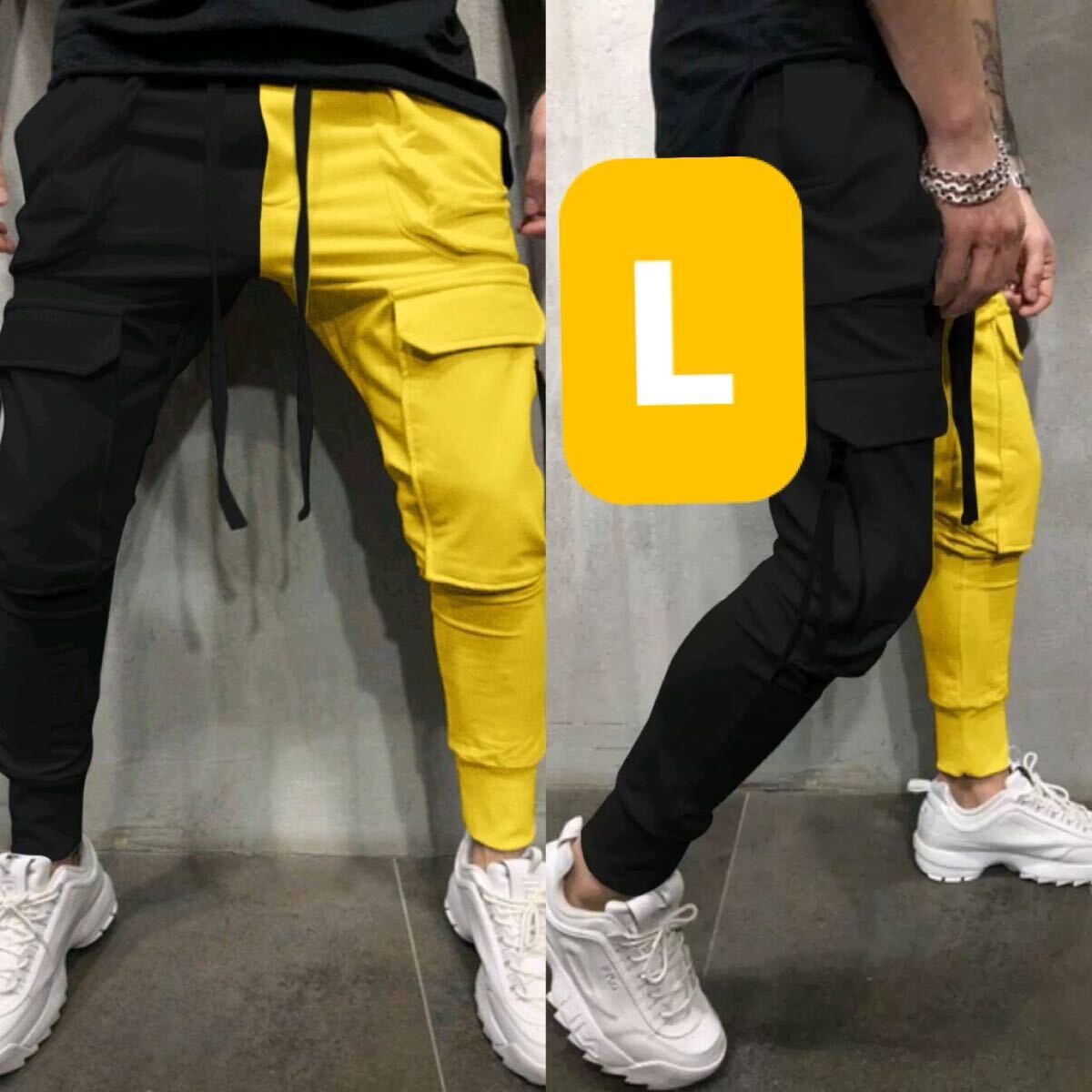 - ジョガーパンツ テーパードパンツ ツートン トラックパンツ カーゴパンツ ワークパンツ トレンド 人気 渋谷 黒 黄色 L