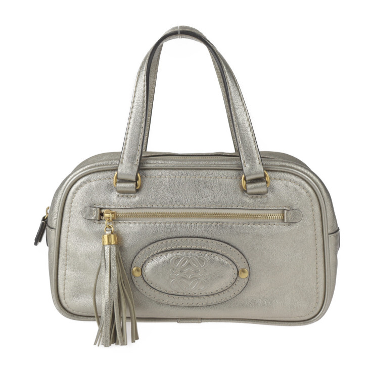 > 美品 LOEWE ロエベ ミニボストンバッグ - ハンドバッグ レザー ゴールド系 アナグラム タッセル フリンジ【本物保証】