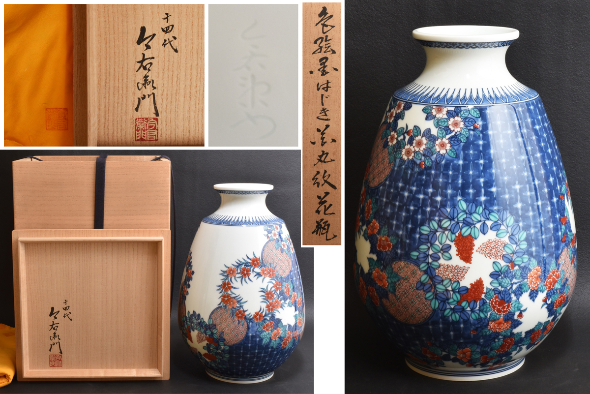 > 5777 十四代 今泉今右衛門・本人作 色絵墨はじき花丸紋花瓶 33cm 無キズ 共箱 共布