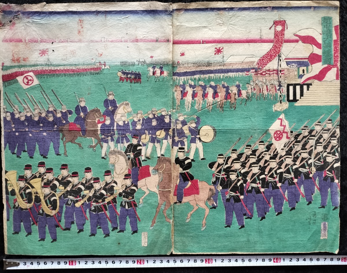 - 明治期/真作 歌川芳虎「越中嶋大調練之図」本物浮世絵木版画 武者絵 錦絵 大判 二枚続き 裏打ち