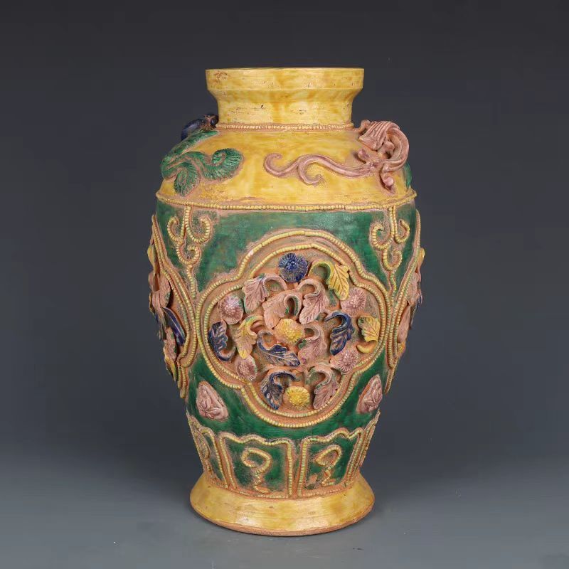 - 唐時代 古陶磁器 三彩 刻花 蛟龍 梅瓶 賞瓶 花瓶 置物 古擺件 時代物 古董品 骨董 旧家蔵出 唐物 中国古玩 古美術品