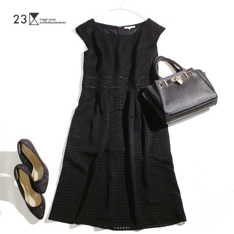 - 美品 23区 株) オンワード樫山 春 夏 シャドー 格子柄 フォーマル シフォンワンピース 9号 38 ブラック 黒 半袖 ワンピース ドレス ミセス