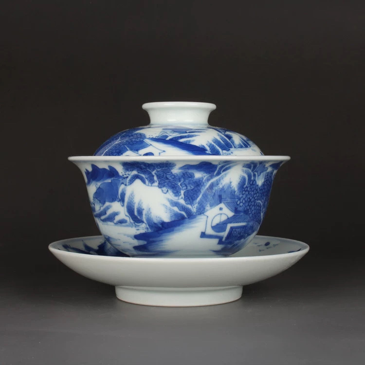 - 「清代 康熙年製 古陶磁器 青花 染付 手絵 山水文 三才蓋碗 茶杯 茶道具 磁器」時代物 古董品 骨董 旧家蔵出し 唐物 中国古玩 古美術品