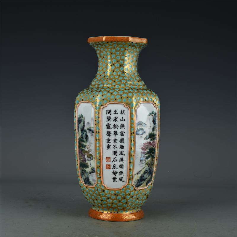 - 多宝閣 ■ 194390 人間国宝 中国磁器【清朝時代の金彩風景詩文八角花瓶】工芸品 施釉陶 陶芸 置物 收藏品 孤品