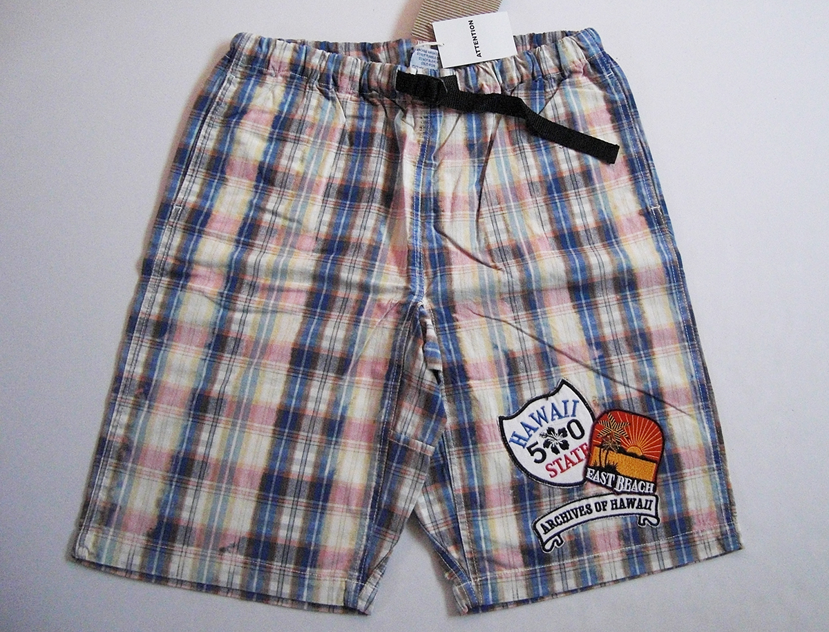 - ♪新古品♪刺繍ワッペン付チェック柄ハーフパン【Blue Paradise】ブルーパラダイス(L)★青.茶.黄★洗い加工