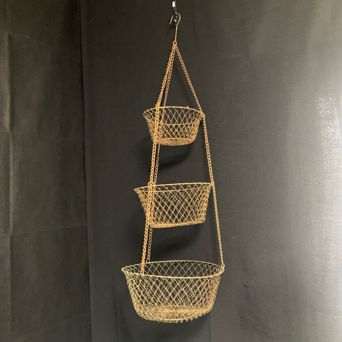 - 3段 吊り下げ かご バスケット キッチン 天井フック付き シャビー 吊り下げ式 ワイヤーバスケット 収納 網カゴ ワイヤーカゴ (A-2328)