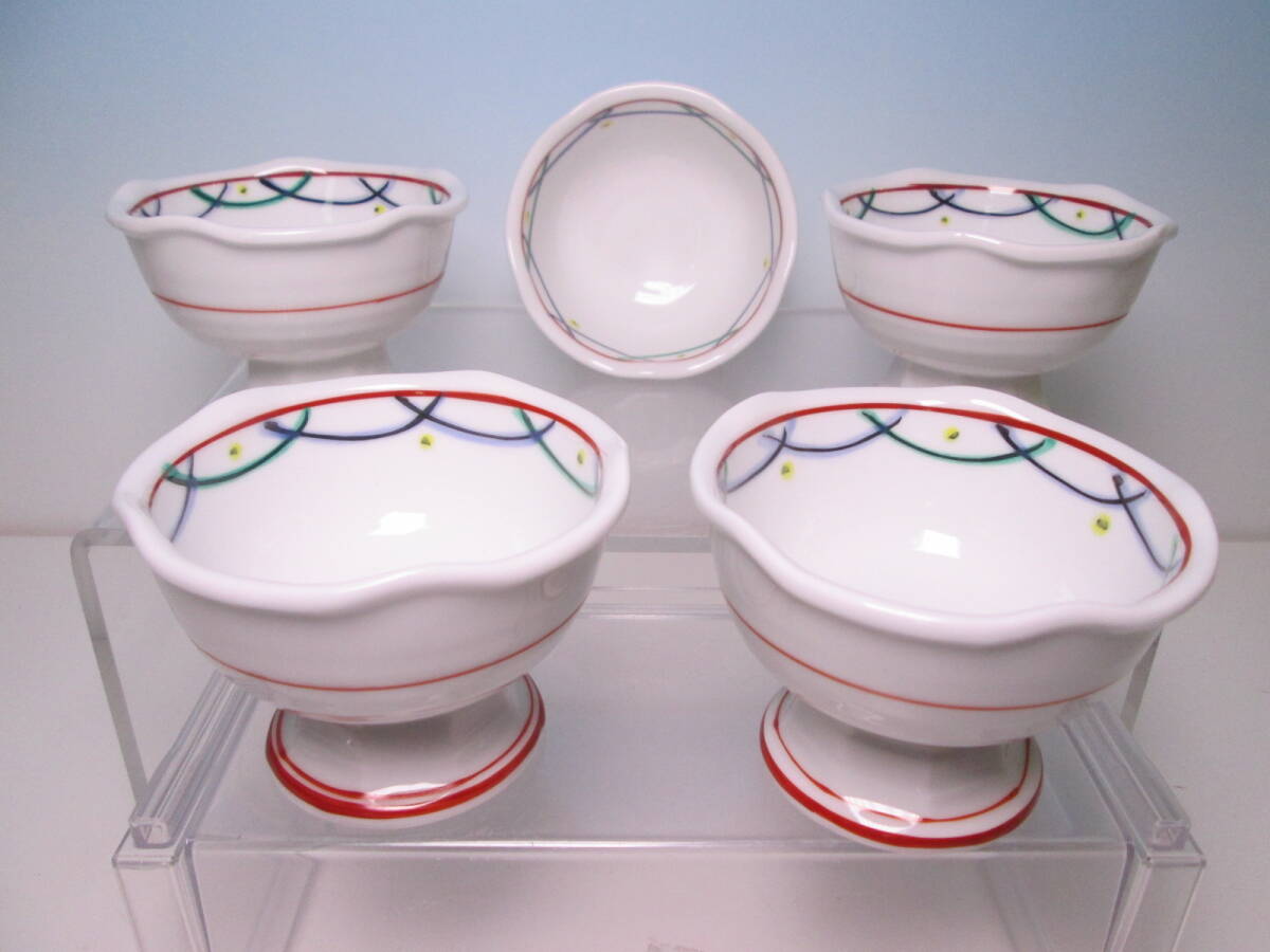 - ☆お料理屋さんの器 在銘 色絵 輪花形 高杯向付 五客 箱無し デザート小鉢/懐石/割烹/日本料理