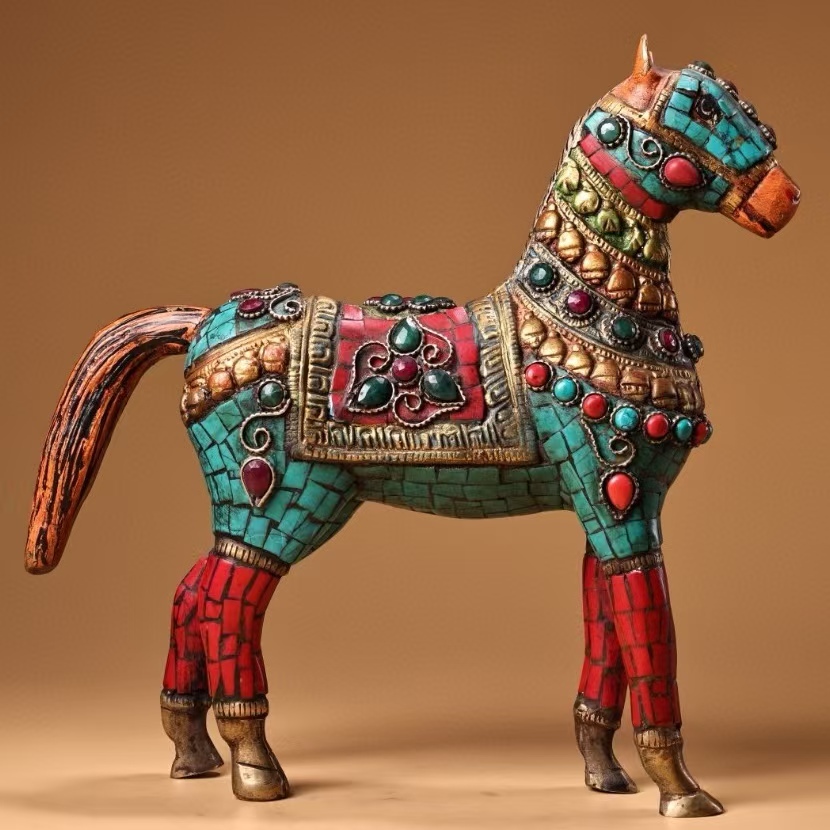 - 清代 旧蔵 チベット古寺 金馬・軍馬・唐馬を描いた古銅モザイク宝石彩色 銅製 銅琉金 唐物 收蔵品 時代物 古美術 古置物 希少珍品 文房具