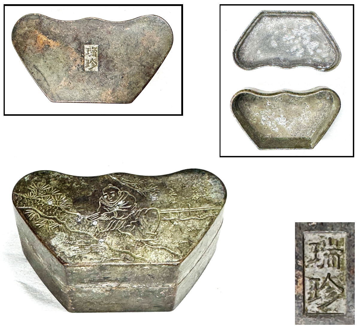 - 【送料無料】清時代 古銅 瑞珍款 寅生刻 松下人物風景図 墨盒 年代物 骨董古玩 書道用品 古道具 細密細工 古美術 (旧家蔵出し) WWST058