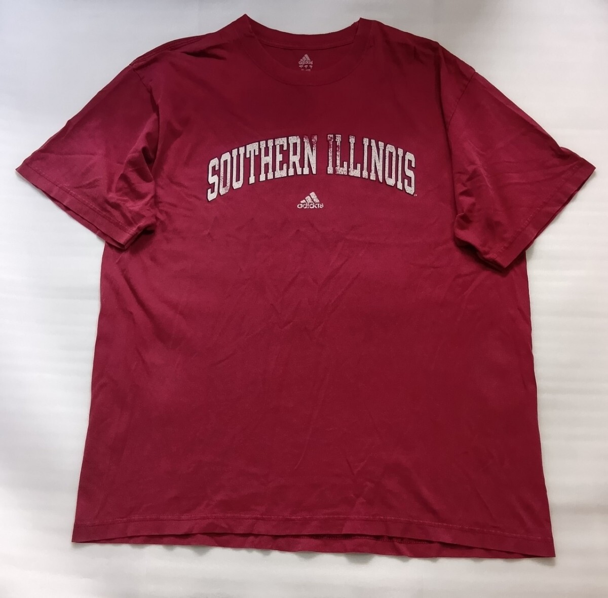 > ☆adidas.com TEE サイズL 半袖Tシャツ 洗濯済スポーツCOTTONファッションSOUTHERN ILLINOIS薄レンガ色バック白プリント ティー アディダス