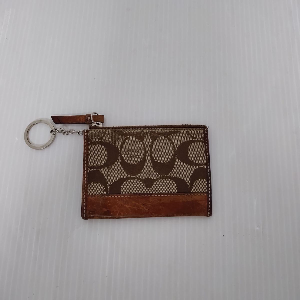 - 【中古】 COACH コーチ コインケース ロゴ入り シグネチャー モノグラム ベージュ ブラウン キーリング付 小物入れ カードケース (EA14)