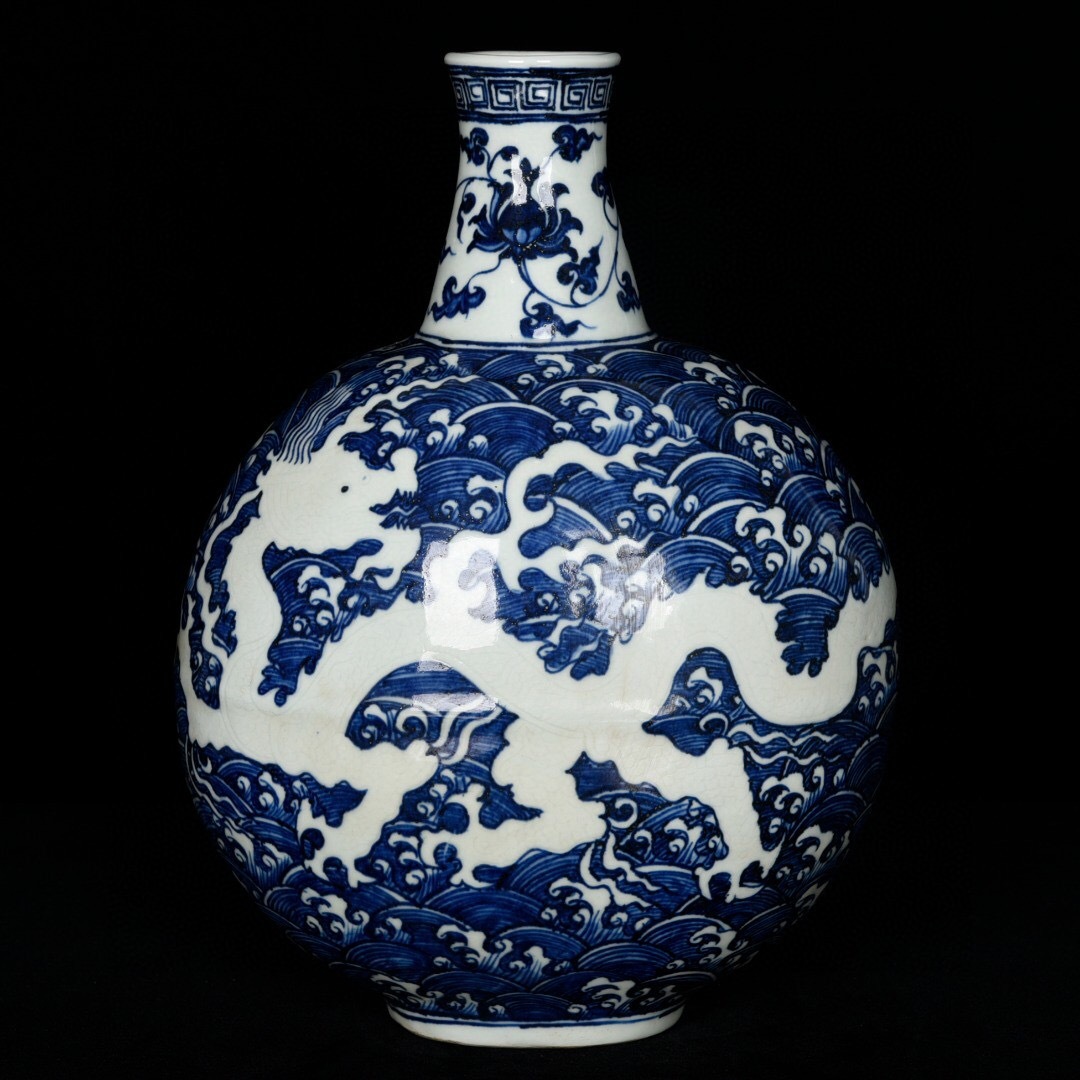 - 『館蔵珍品 明 永樂年製款 古陶瓷品 青花 留白 海水龍紋 扁瓶 陶藝』稀少珍蔵品 古賞物 貴重物品 収蔵品 中国古美術 時代物 古董品
