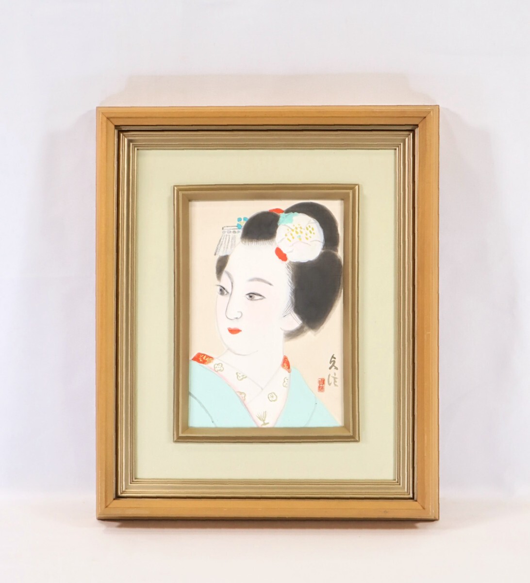 - 真作 山平貞信 日本画「舞妓」画寸 15.5cm×23cm SM 兵庫県神戸市出身 寺島紫明に師事 清楚で気品ある表情、透き通る肌、綺麗な艶姿 10998