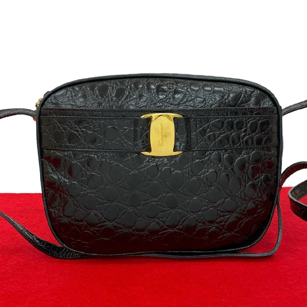 - ほぼ未使用 Salvatore Ferragamo サルヴァトーレフェラガモ ヴィンテージ ヴァラ 金具 クロコ 型押し レザー ショルダーバッグ 黒 45173