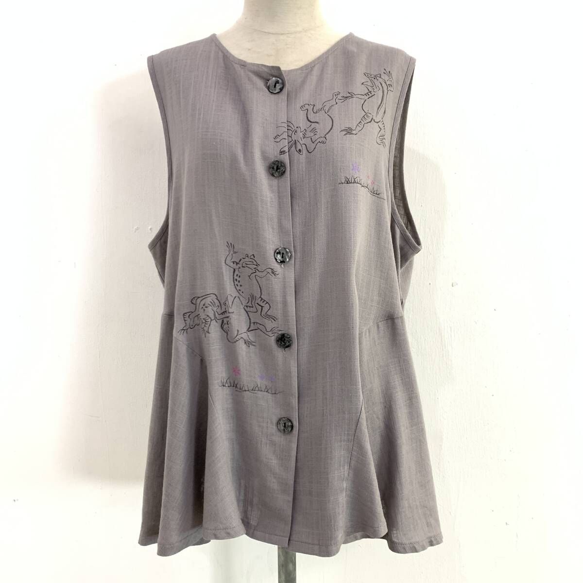 - ☆鳥獣人物戯画 レーヨン×リネン 麻混 ノースリーブ チュニック ベスト ワンピース ブラウス グレー系 古着【レターパックプラス郵送可】H
