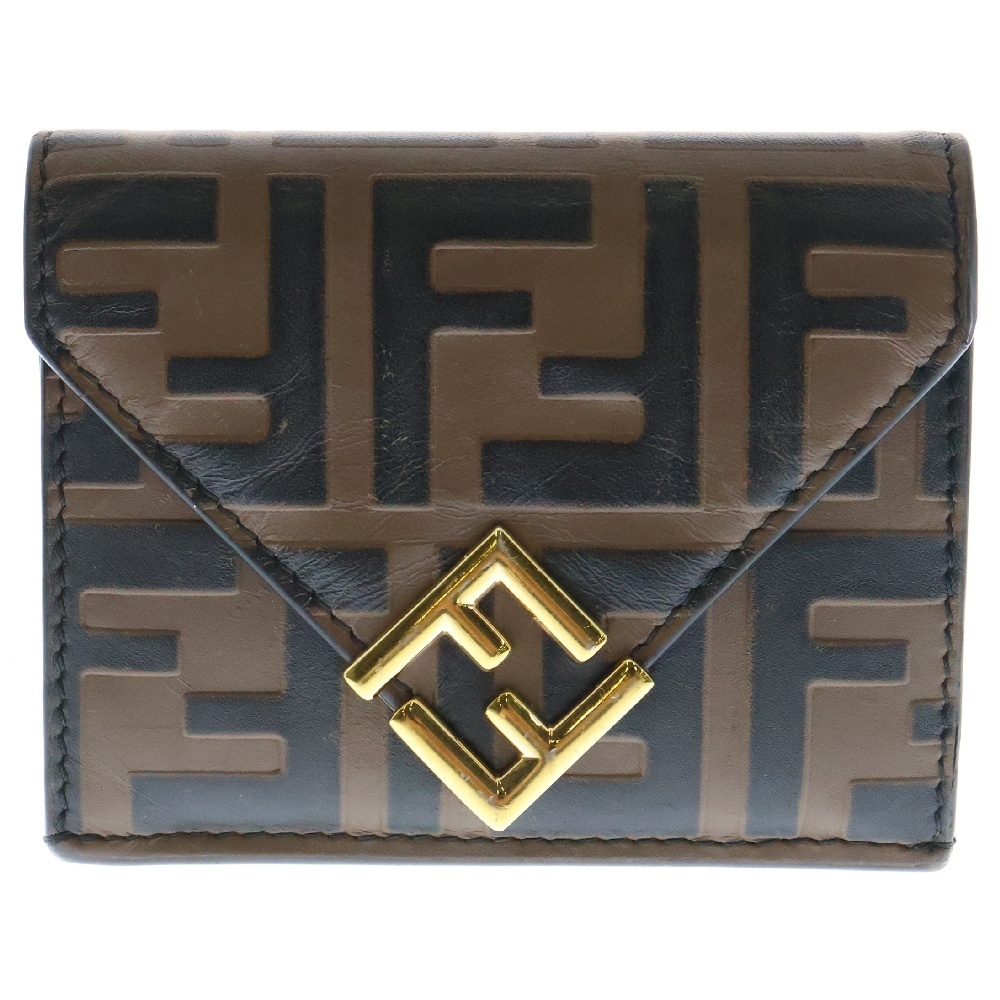 - FENDI フェンディ FFダイヤモンド 三つ折り財布 コンパクトウォレット ゴールド金具 ブラウン ズッカ柄 レザー 8M0480