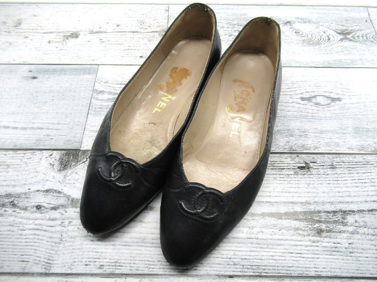 - ☆【B送900円】1913 CHANEL シャネル ココマーク レザーパンプス ロゴ ブラック ローヒール イタリア製 レディース 35 1/2