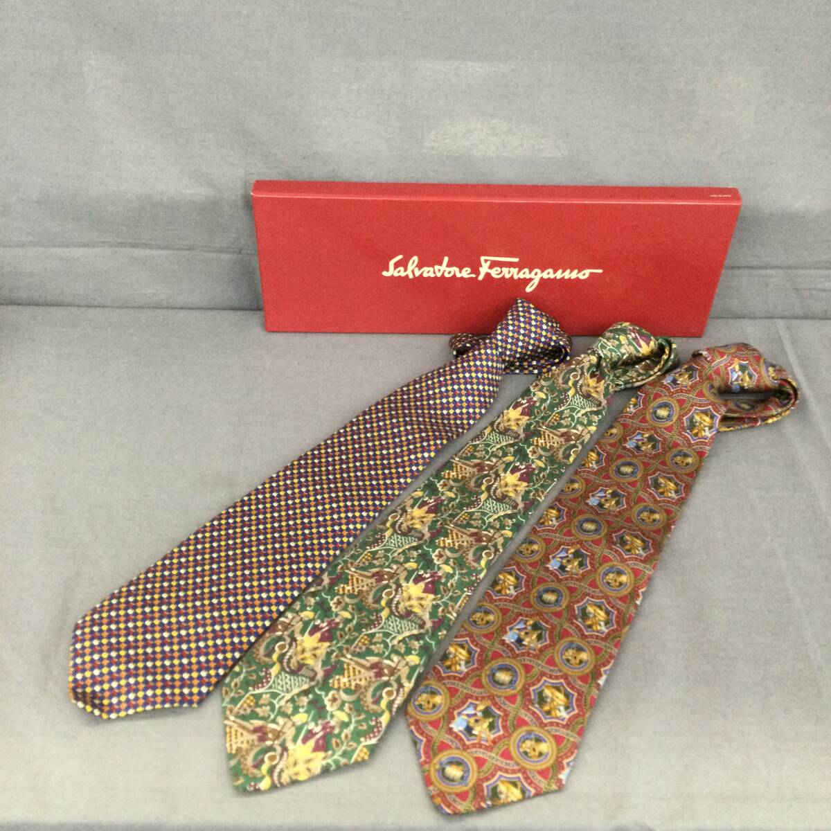 > 070620 290852-3 ネクタイ Salvatore Ferragamo フェラガモ 3点まとめ 多色柄デザイン シルク100% 紳士小物 1点箱付き