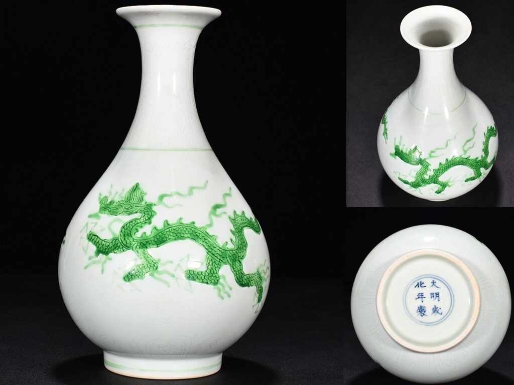 - TB242■中国古玩 唐物 明成化 緑釉刻雲龍紋 玉壺春瓶 極上品■高さ23cm・直径13cm■