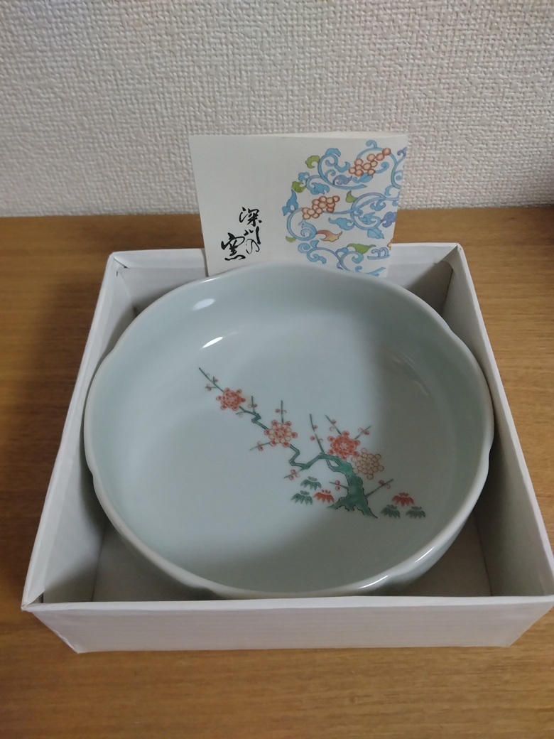 - 深川製磁 薄緑青灰色 梅笹 中鉢 美品 箱あり 有田